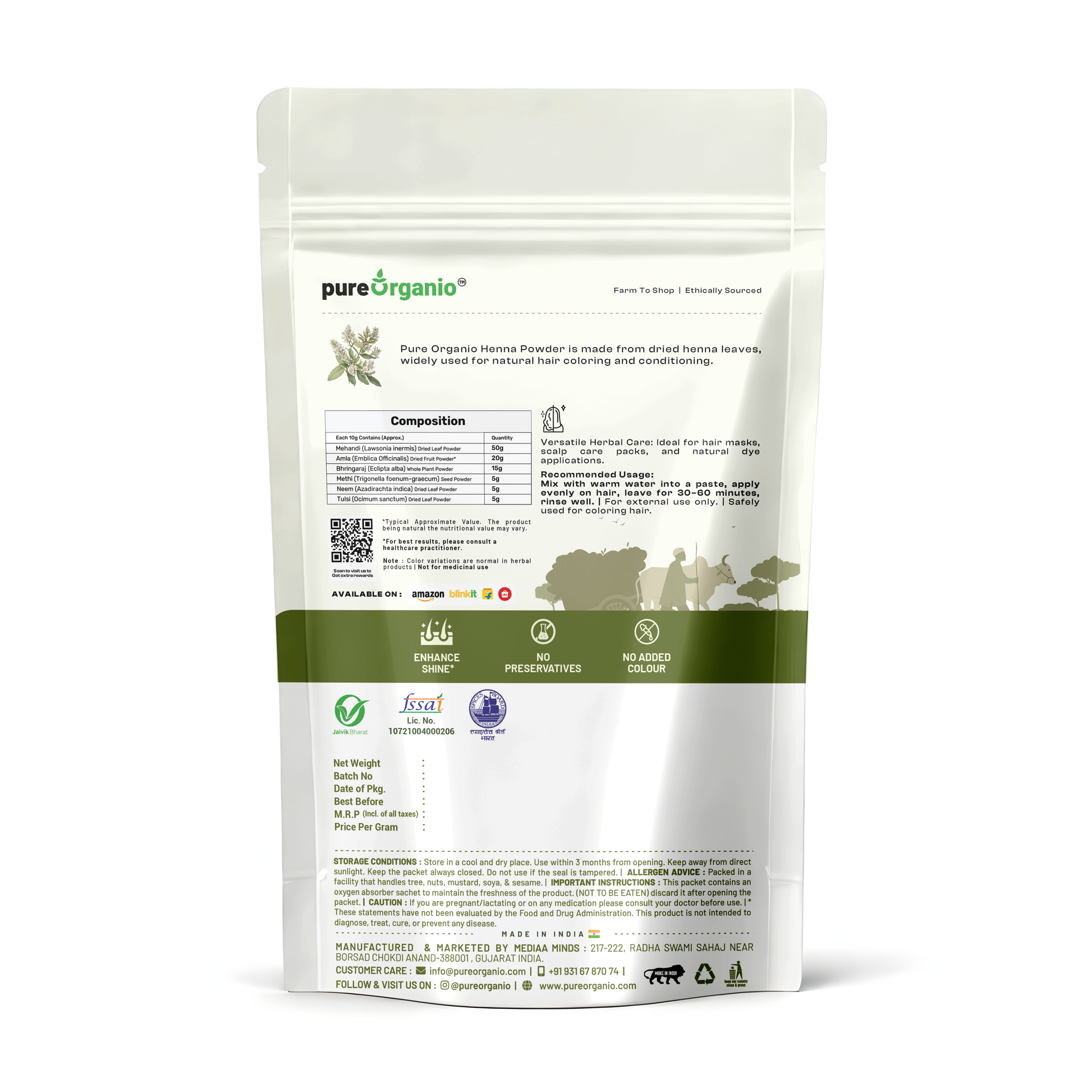 Pure Organio Natural Henna Powder | 100% Natural, Triple-Sifted, Chemical-Free Hair Color & Conditioner | For Rich Reddish-Brown Tint, Anti-Dandruff & Hair Growth